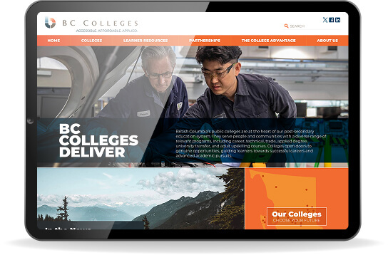 BC Colleges represents a network of institutions that serve a wide range of communities, offering everything from adult education to trades, technical, career, and university transfer programs. The organization provides essential pathways to employment and further education throughout the province. When BC Colleges approached us, their website was struggling under the weight of too much content and a lack of clear messaging. The homepage failed to highlight the strengths of the colleges or explain why students should choose to study in BC.